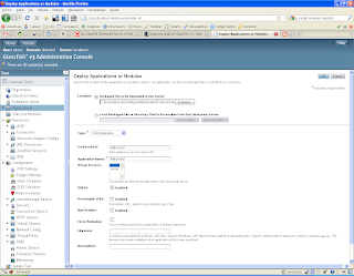 Al dar clic al botón deploy aparecerá un formulario donde tendremos que buscar en nuestro equipo el WAR que vamos a desplegar, el tipo de objeto que será desplegado, el nombre con que será llamado e identificado ,el servidor virtual donde se alojará, entre otras. Antes de querer desplegar una aplicación con Grails recomiendo descargar este HelloWorld y subirlo a GlassFish para estar seguros de que GlassFish está funcionando correctamente.